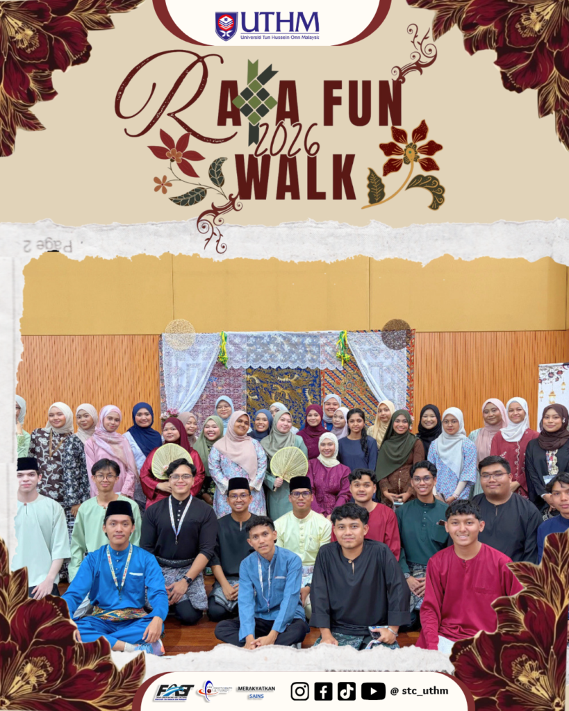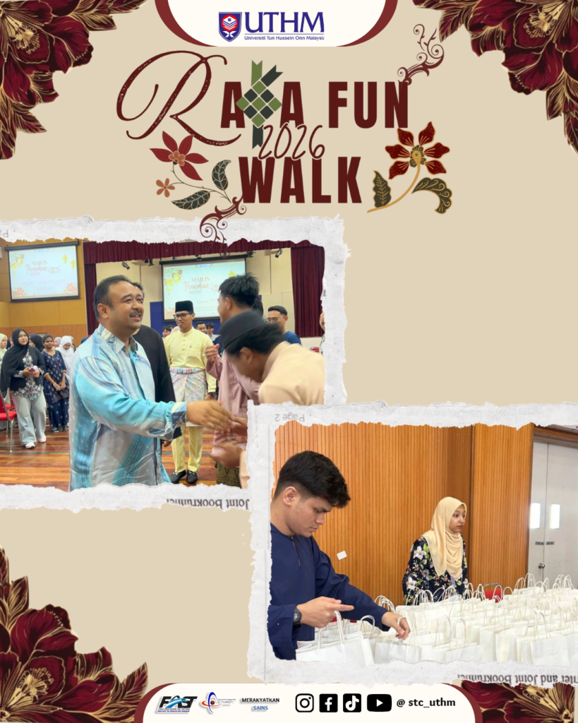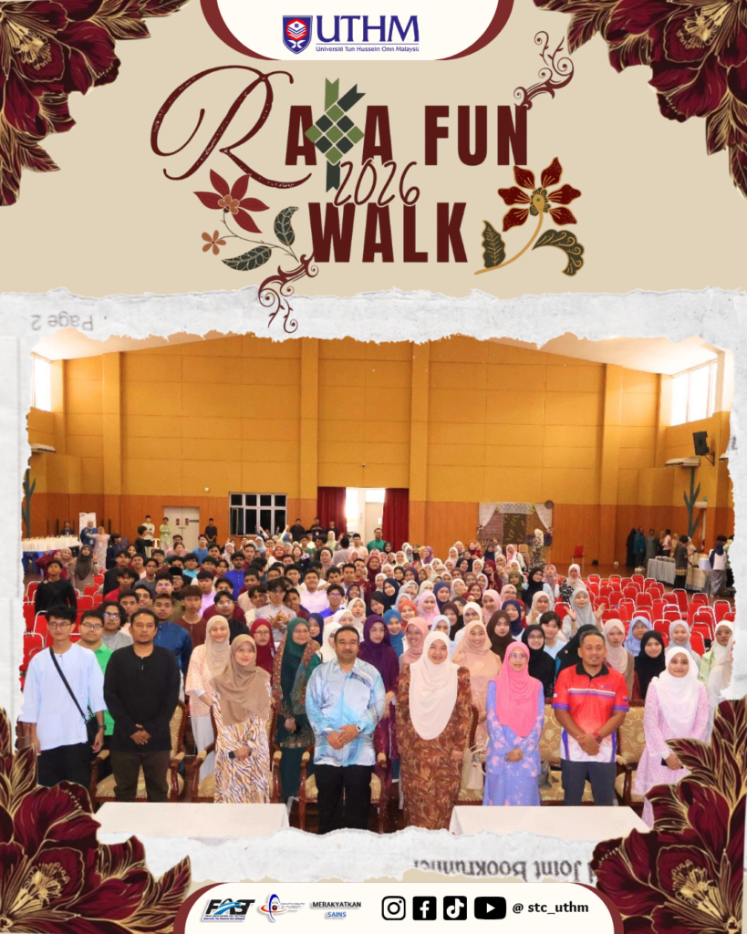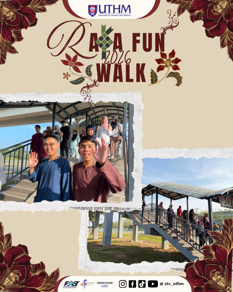 Pada 11 April 2026, Kelab Sains dan Teknologi (STC) dengan kerjasama Fast Postgraduate Chapter (FPC), Fakulti Sains Gunaan dan Teknologi (FAST), Universiti Tun Hussein Onn Malaysia (UTHM) telah berjaya menganjurkan Program Raya Fun Walk dengan penuh meriah dan semangat kebersamaan.