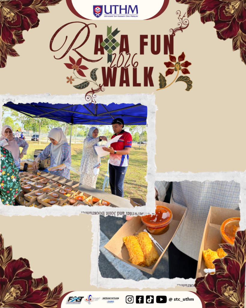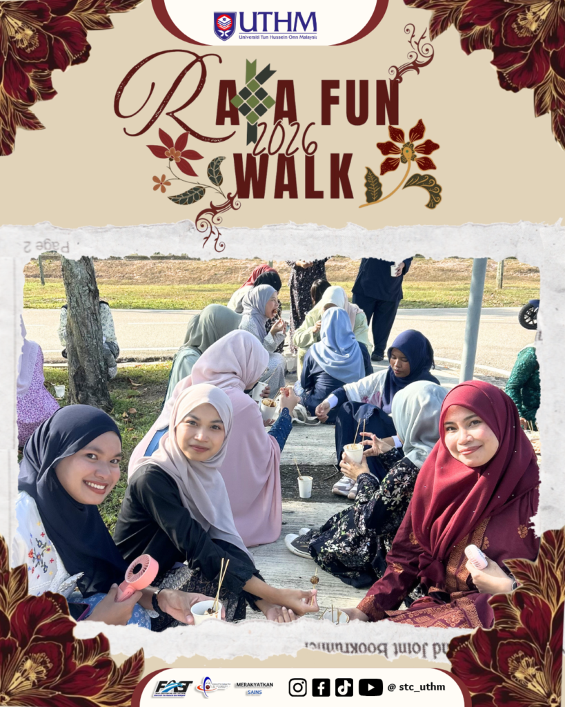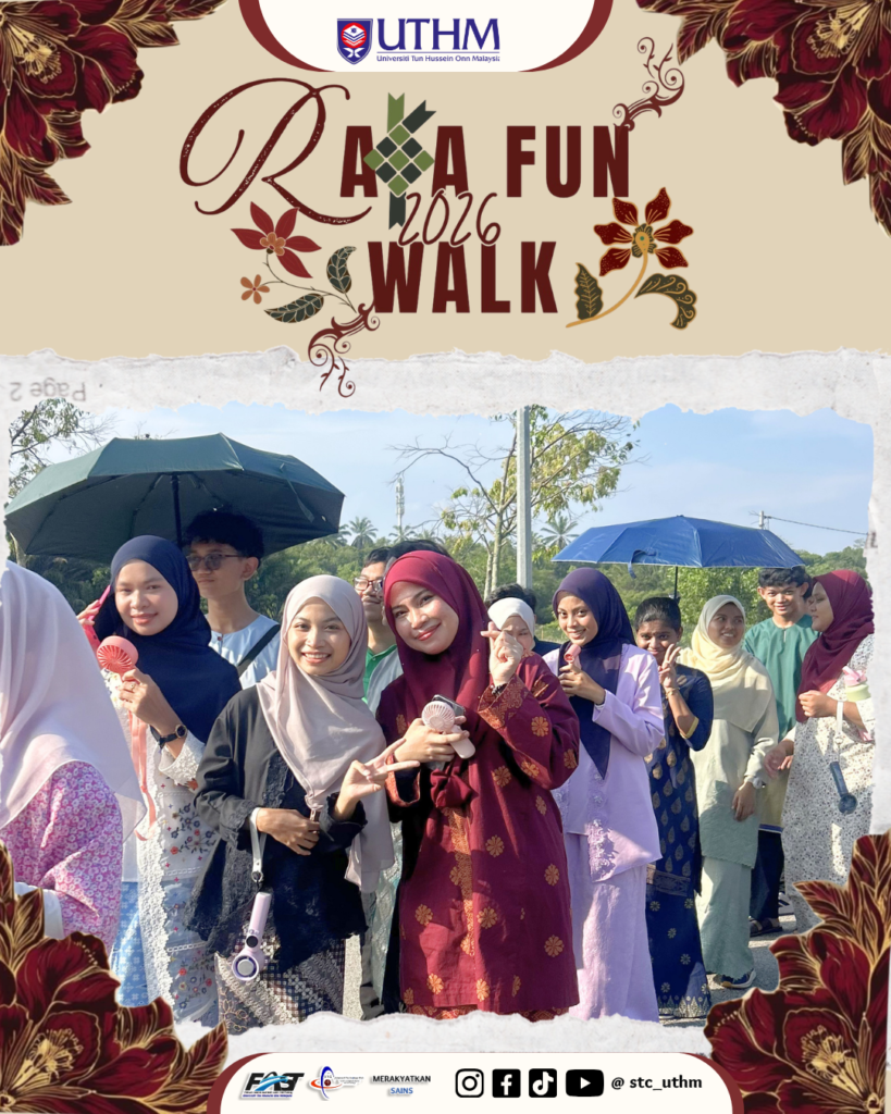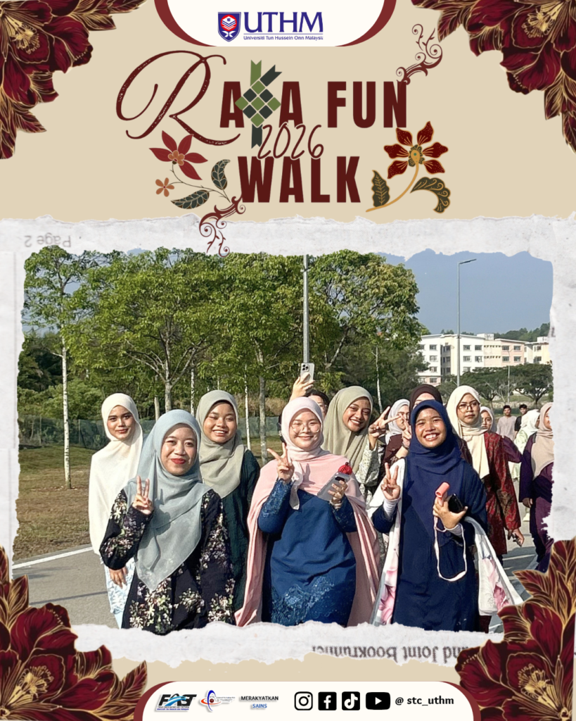 Pada 11 April 2026, Kelab Sains dan Teknologi (STC) dengan kerjasama Fast Postgraduate Chapter (FPC), Fakulti Sains Gunaan dan Teknologi (FAST), Universiti Tun Hussein Onn Malaysia (UTHM) telah berjaya menganjurkan Program Raya Fun Walk dengan penuh meriah dan semangat kebersamaan.